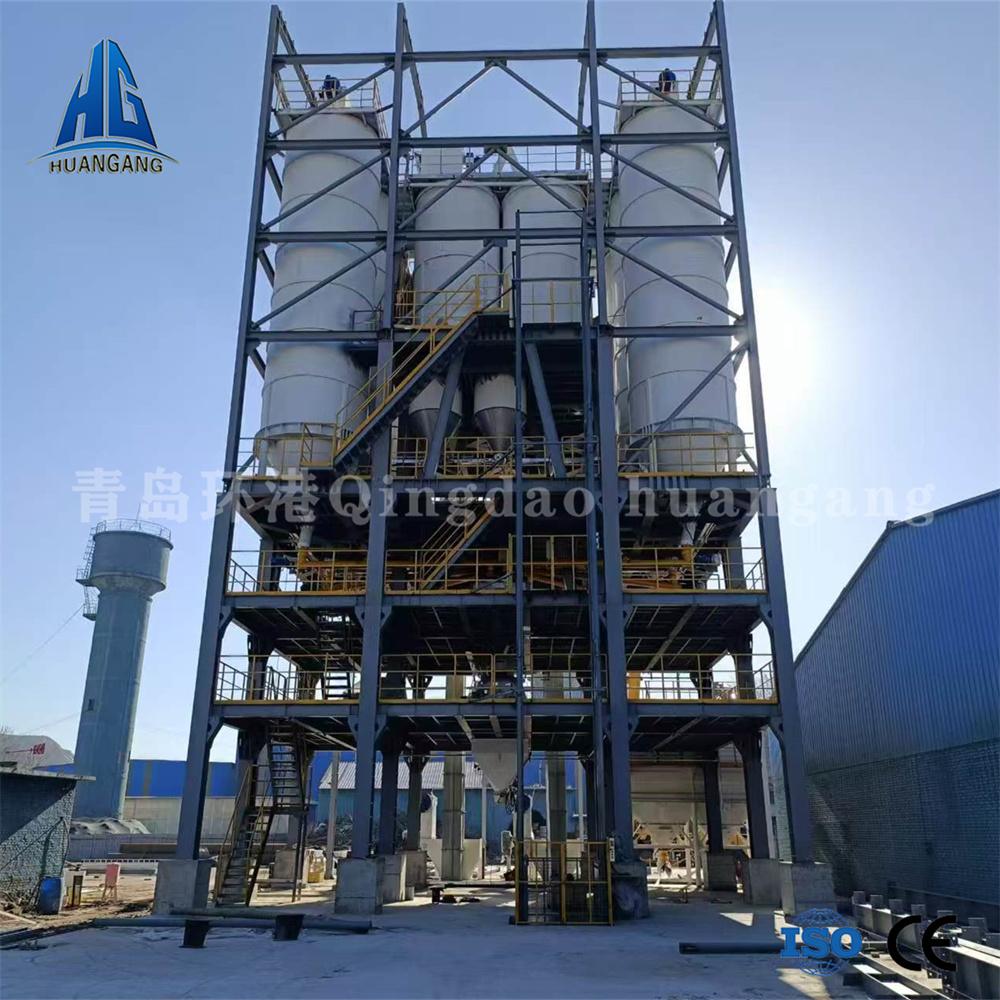 年產兩萬噸左右的砂漿生產線,一般情況下會用到3-6個原料罐,其中兩個大罐用于裝放散裝水泥和粉煤灰,其余小罐用于裝放輕鈣、重鈣、砂等。散裝水泥和粉煤灰進罐不需要提升設備,依靠泵車打入。散裝粉煤灰倉一般為圓筒支架結構,其上部有除塵設備,防止粉塵泄漏,下部裝有破拱裝置,防止粉料結塊,使粉料卸出順暢,并裝有料位傳感設備,可隨時掌握倉內物料使用情況。