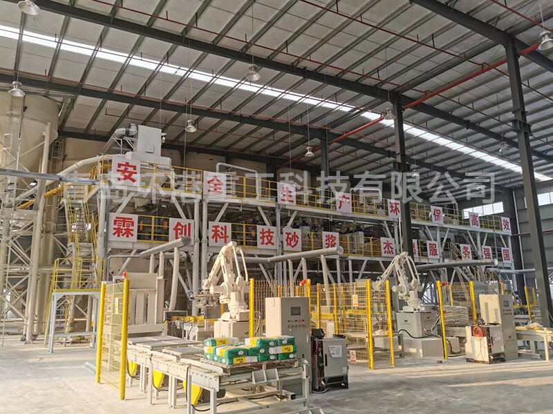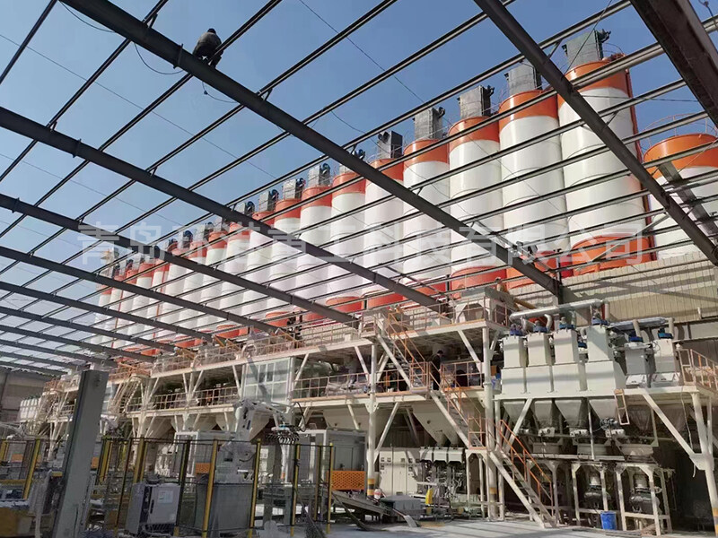 這是一套年產(chǎn)50萬(wàn)噸的全自動(dòng)環(huán)保膩?zhàn)臃鄢商自O(shè)備。通過(guò)調(diào)配原料的比例不同可生產(chǎn)內(nèi)墻膩?zhàn)印⑼鈮δ佔(zhàn)印⑵胀佔(zhàn)印㈢R面膩?zhàn)印⑹嗄佔(zhàn)拥榷喾N類膩?zhàn)臃郛a(chǎn)品。每小時(shí)根據(jù)所選型號(hào)不同,可生產(chǎn)10~50噸產(chǎn)品,生產(chǎn)線主樓采用塔式結(jié)構(gòu),粉料倉(cāng)安裝在主樓頂部,外加劑系統(tǒng)采用獨(dú)立平臺(tái)計(jì)量泵送。骨料自上而下經(jīng)過(guò)計(jì)量層、混合機(jī)層、成品倉(cāng)、包裝機(jī)、碼垛線。根據(jù)膩?zhàn)臃鄣呐浞揭螅赏ㄟ^(guò)電腦計(jì)量精確配料后,經(jīng)過(guò)混合主機(jī)攪拌,即時(shí)生產(chǎn)出需要的膩?zhàn)臃郛a(chǎn)品。全過(guò)程采用智能自動(dòng)化操作模式,減少人力投入。